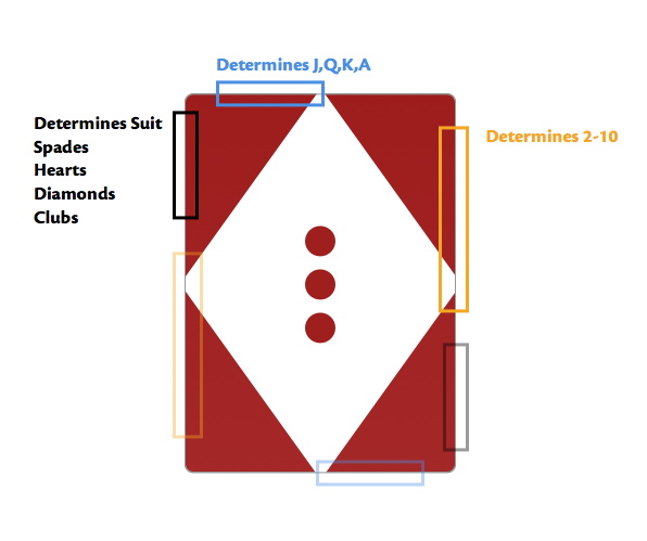 Each card in the deck has subtle carved out notches on its edges. Notches on the short edge of the card determine J, Q, K, A and notches along the long edges indicate its suit and tell if it’s a 2-10 value card.